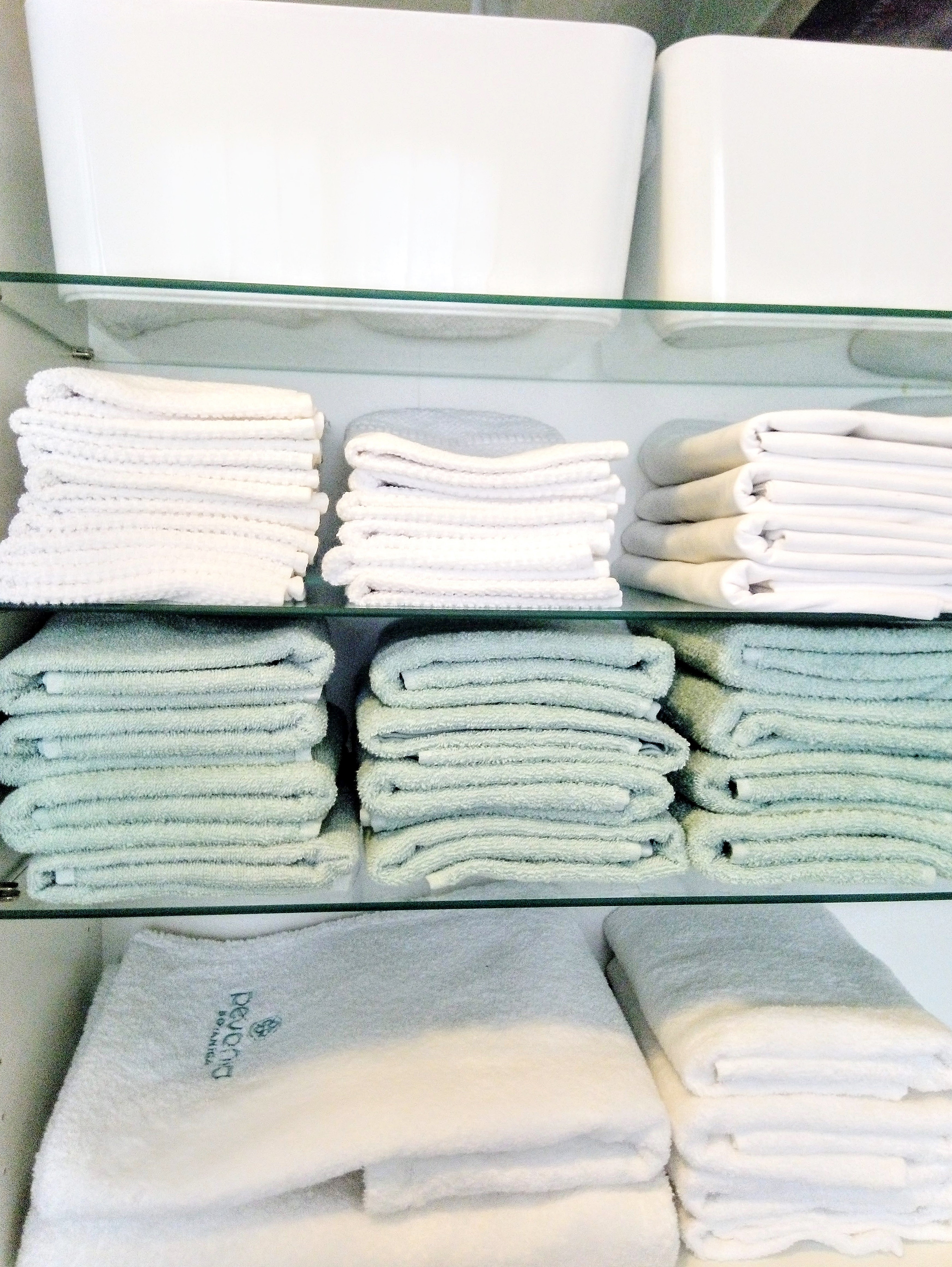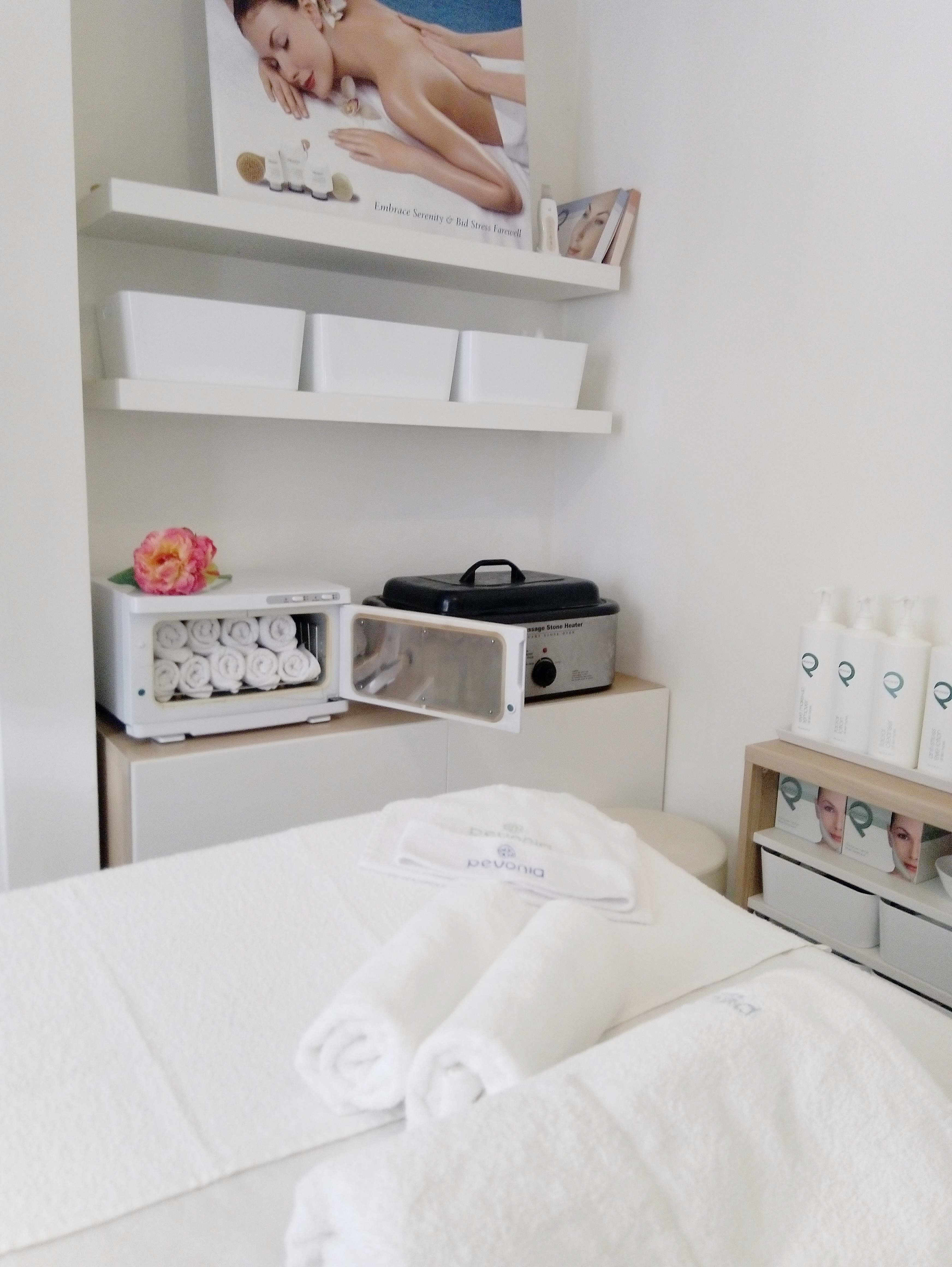 Pro každou klientku je vždy připravené ,,ustlané" lehátko. Velká osuška, ručník pod hlavou, čelenka, malý ručníček, paero na převlečení, ručník na zábal rukou a několik obličejových ručníků připravených na smývání produktů v hot cabi ( Speciální ohřívač, do kterého se dávají ohřívat komprese až na 80 stupňů. Ohřívač současně působí jako UV sterilizátor.)